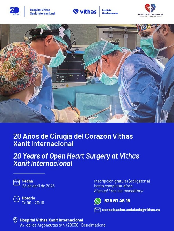 El 23 de abril a las 17:00 h, el Hospital Vithas Xanit Internacional celebra 20 años de cirugía cardíaca con una jornada única junto a expertos como el Dr. Pedro Aranda. Un evento gratuito con plazas limitadas dirigido a profesionales y público interesado